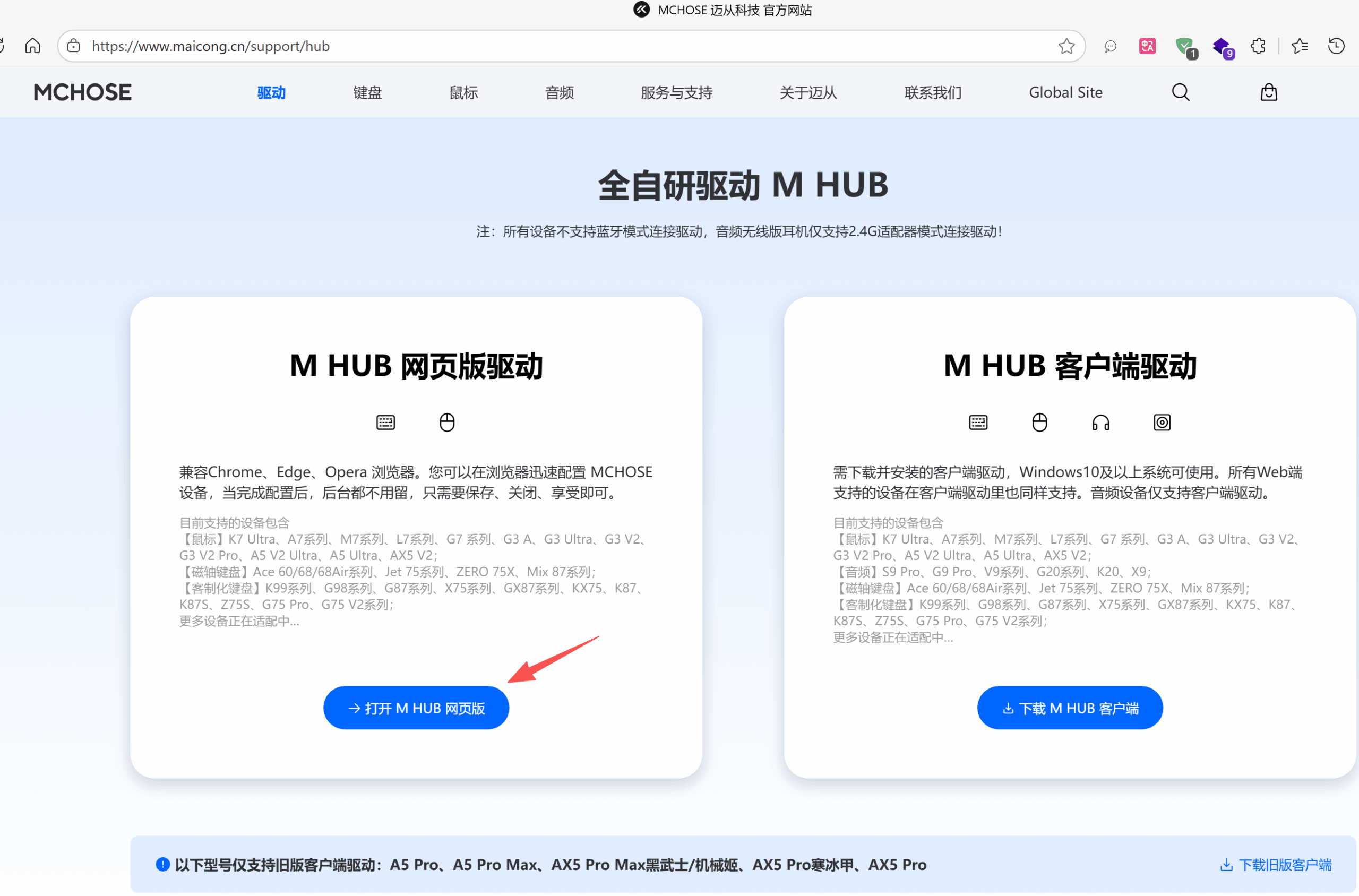 昨天想看看鼠标还剩多少电,电脑上又没装驱动,于是直接打开了迈从的官网支持页面——居然可以直接在网页上连鼠标查电量,不得不说,这个设计对不想装软件的用户来说,真的挺友好。
