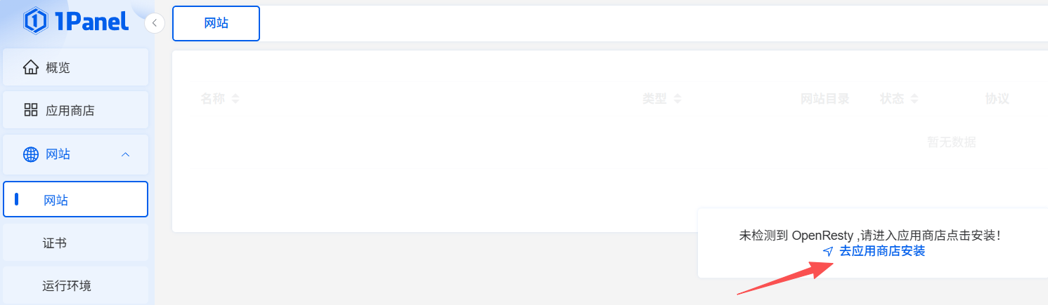 安装完毕后,我们点击网站,会发现没有环境,那就点击去安装