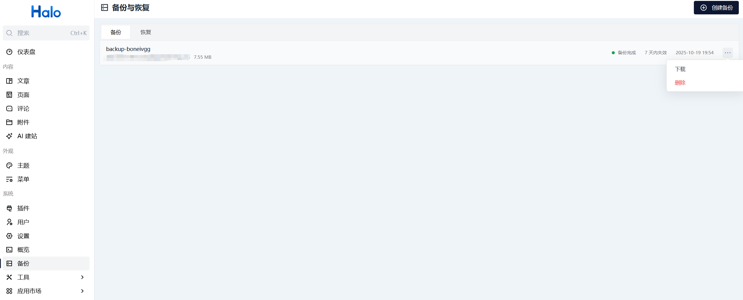 - 1Panel → 「数据库」→ 选中Halo数据库 → 点击「备份备份列表」→ 点击「备份」。