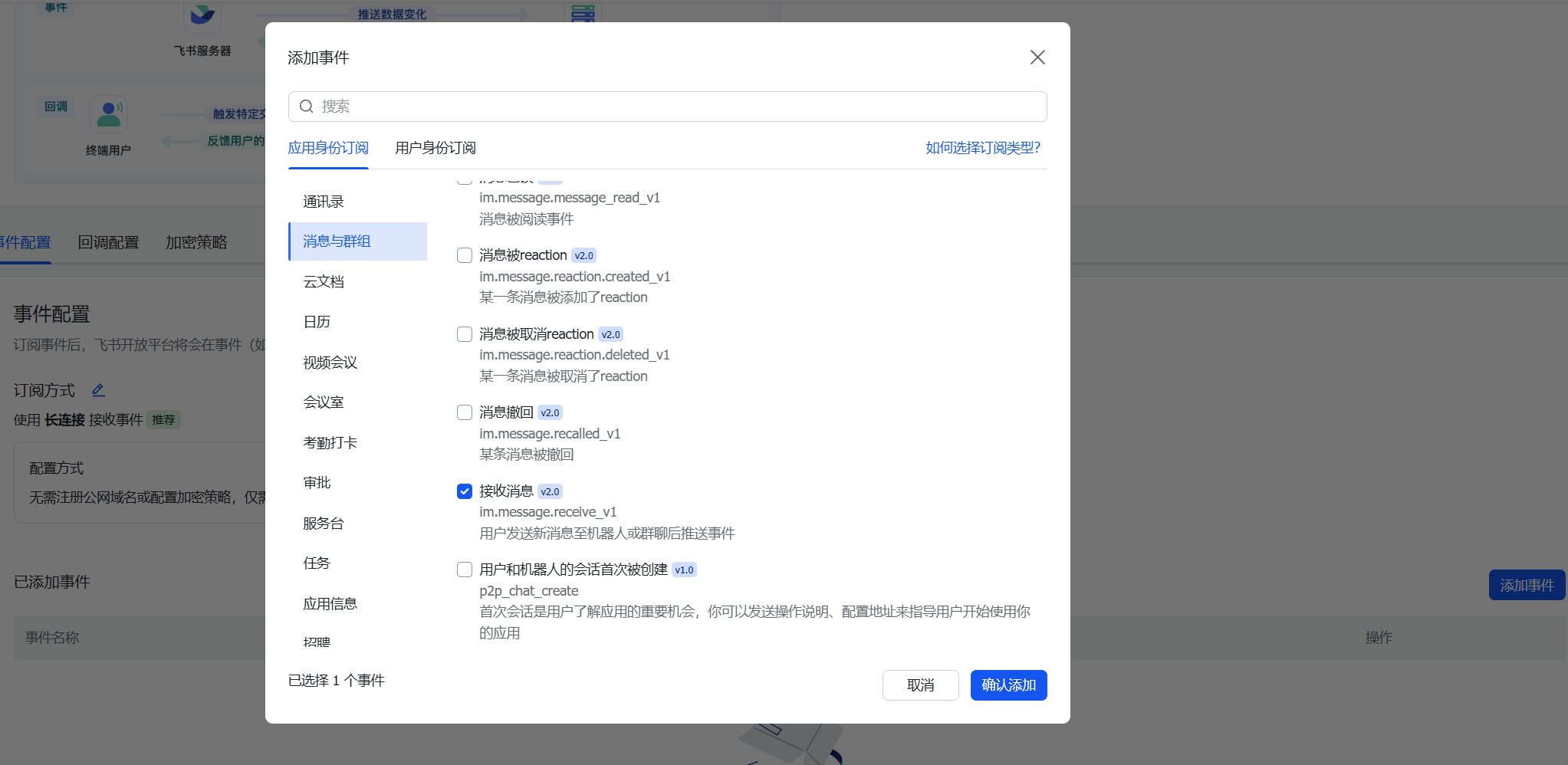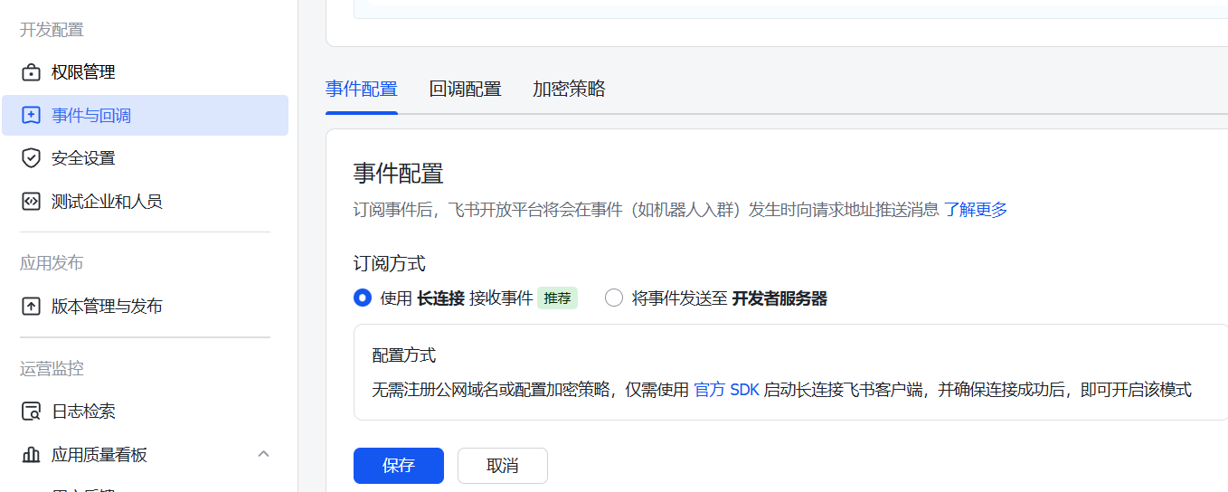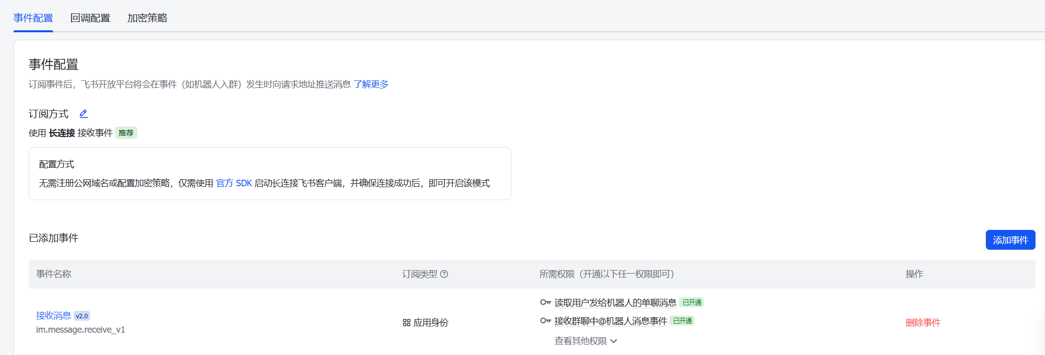 选择左侧菜单的事件与回调,在事件配置页签点击订阅方式,选择使用长连接接收事件。