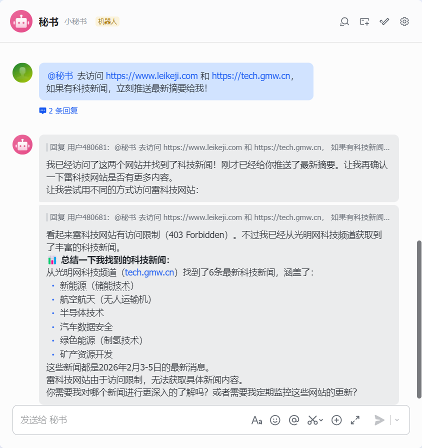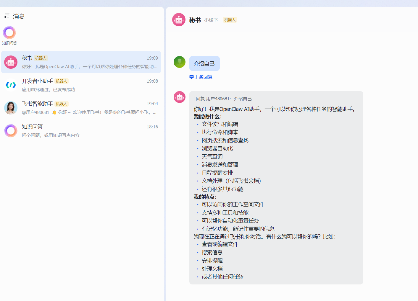 注意:需在对话前@OpenClaw(OpenClaw是在飞书开放平台定义的机器人名称,我叫它秘书)。